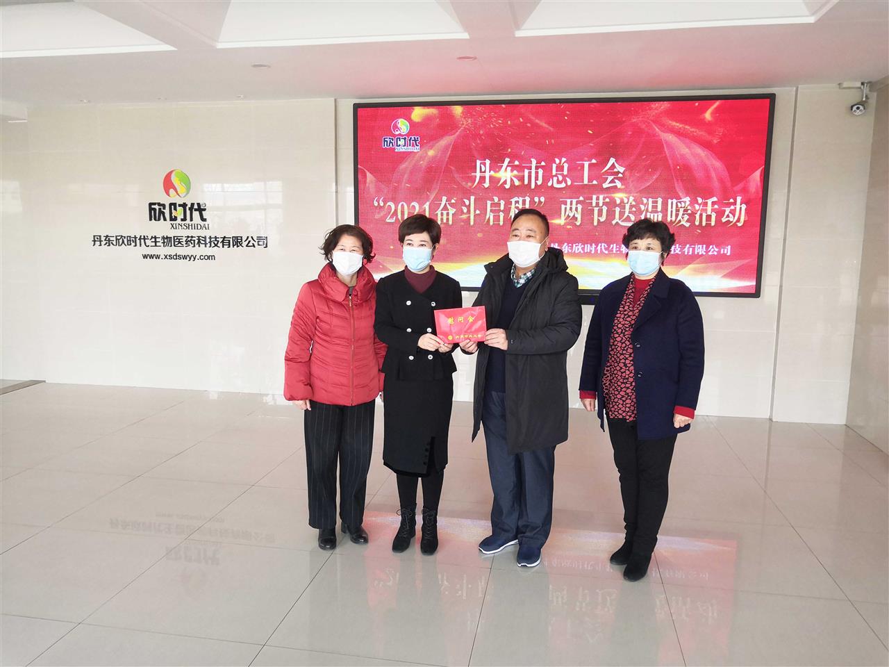 2021年1月14日,丹東市總工會牛主席與何副主席一行來到丹東欣時代生物醫(yī)藥科技有限公司為企業(yè)員工送溫暖。